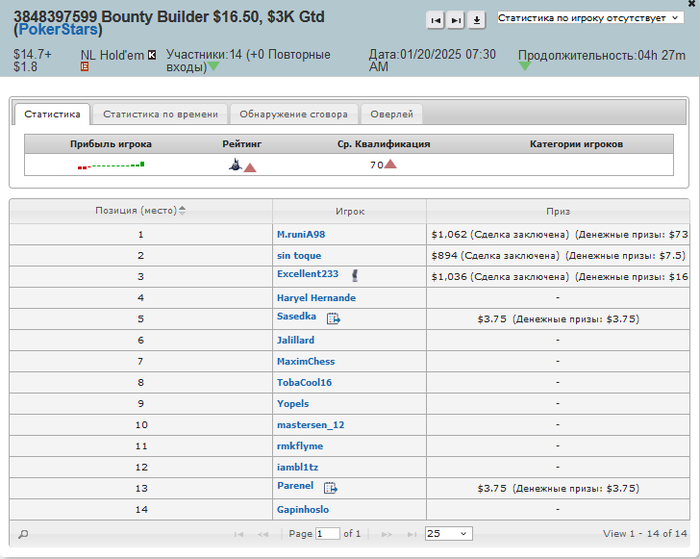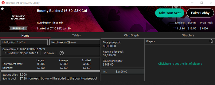 14 человек, 16.5 БИ, призы 3к. Половина = афк. А у меня еще был удвоенный стек. Бери да выходи на финалку изи....