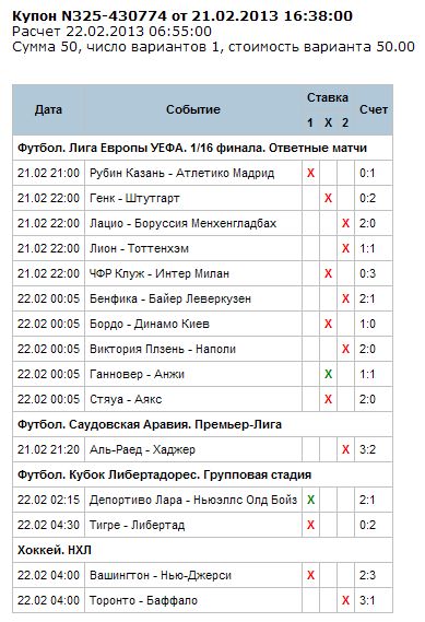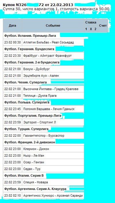 22 февраля 2013 год! Начинаем! Вчера в ТОТО сошлось всего 2 варианта, карты вообще не дают результат! Сегодня думаю ставить ТОТО или нет, жалко 50 рублей мне на эту лабуду! Но все же склоняюсь что нужно поставить, но время еще подумать есть!