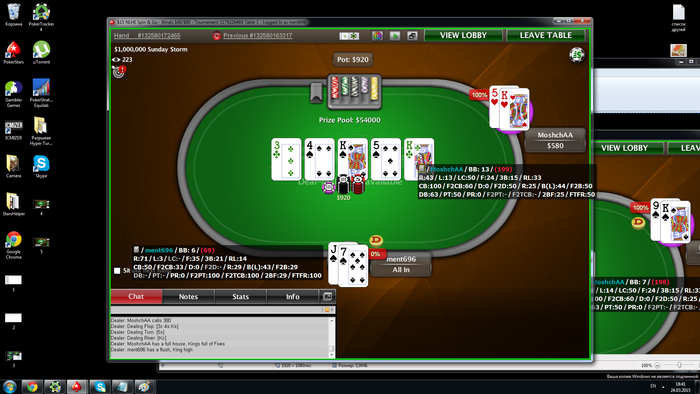 Мне удалось реализовать свое приемущество (или хорошо заходили карты )и мой стек увеличился до 980. И тут последовало вот такое выставление: