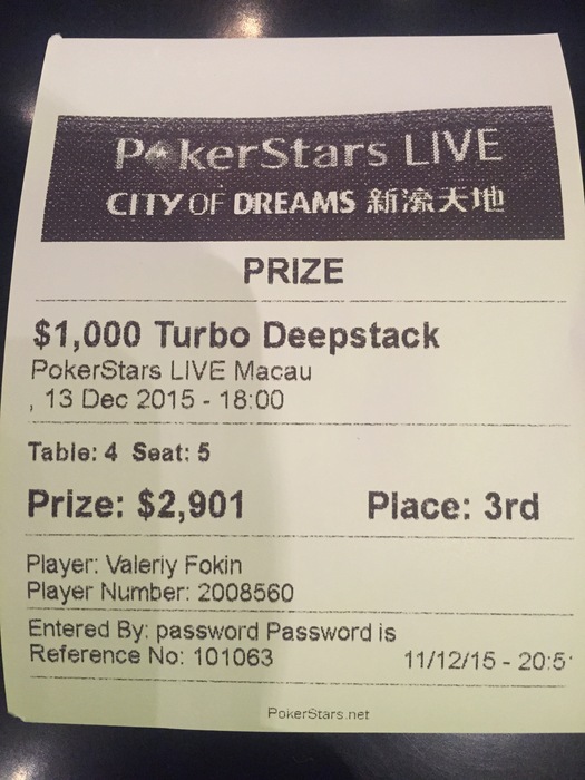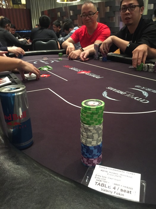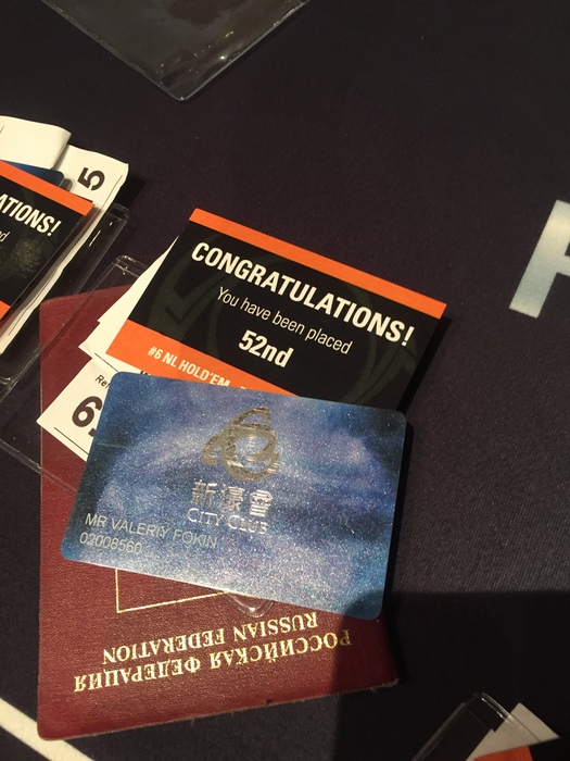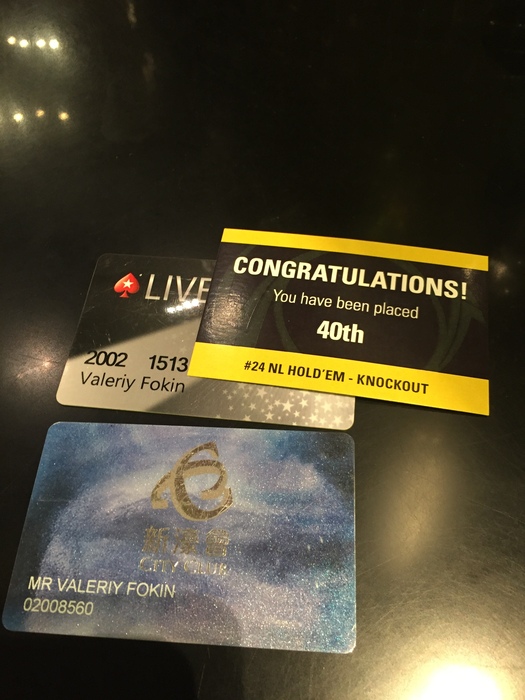 Всем, привет и с Наступающим Новым 2016 годом!!! Появился час свободного времени перед тем, как начать стругать продукты на ведерко оливье))), решил отписаться в блоге до наступления 2016 года! Постараюсь максимально продуктивно и кратко описать эти несколько месяцев, которые прошли с момента создания моего блога. Весной, еще находясь, в Китае, прочитал на форуме ДТ о турнирах ВРТ и IPS, весенние этапы как раз совпадали c датами нашего приезда в Беларусь. Я решил поехать сначала на всю серию IPS, но приехав в Брест в первый же день выиграл сателлит на Хай роллеров ВРТ, и отобрался на 888 на главное событие IPS, так что пришлось совмещать поездку в Минск и Гродно - о чем нисколько не пожалел! Забронировал 5 дней проживание в Минске и 3 дня в Гродно, в Минске отыграл 4 турнира, где был просто жестоко …. убит в трех турнирах, при том, что проходил всегда в среднюю стадию турнира с хорошим стэком, но потом случалась авария и я проиграл все что можно, минимум имея шансы 70/30 % , бывало оппоненты вытаскивали и по 2 аута против меня, начало было не очень впечатляющим и я совсем расстроился, но решил перед отъездом заскочить еще в турнир-Супернокаут, где все сложилось почти очень хорошо и я попал за финальный стол, но и там меня ушатали! Агроманьяк, один из чипаков, запушил с баттона в двух коротышей, малый блаинд кол, я на бб поднимаю-АА, инстаколл, баттон открывает К8, малый-88, на флопе KK8 турнир для меня закончился 6-ым местом из 127 входов, должен был брать минимум топ 3, но не судьба)) На следующий день поехал в Гродно на день 1В главного события серии IPS на которое у меня был билет, не буду рассказывать, как я вылетел в первые 3 раздачи, это секртет, но было интересно провести один эксперемент))) Сделав реентри, я прошел в день 2 и вылетел на 15-ом месте из 89 входов при 10-ти призовых. Турнир проходил в небольшом казино, атмосфера царила дружеская, я познакомился и пообщался с организаторами и членами команды IPS , все ребята произвели очень приятное впечатление! На следующий день все отправились на вечеринку закрытие серии в шикарный клуб, где отрывались до утра, я чуть не опоздал на автобус до Бреста в 10 утра, но благополучно вернулся домой))) Практически все лето я провел в Бресте, раз-два в неделю выбирался на турниры в местный клуб, кототкрыл мой знакомый, поигрывал микролимиты на старзах, никаких интересных заносов не было , поэтому в блог не выкладывал. Ездил в Москву на трассу Moscow Raceway на гоночную серию BlancPain поболеть за своего земляка и товарища Марка Шульжицкого, это был его первый этап на Родине, поэтому я просто не мог не поехать и не поддержать его! Ездил с семьей отдыхать в Сочи и Абхазию, где повредил спину( старая травма) так что с экстримом временно завязал, пока не восстановлю здоровье! В сентября удалось побывать на Дальнем Востоке 2 недели, увидится с родителями и старыми друзьями и с конца октября с семьей вернулись в Китай на работу! Решил играть на старзах более серьезно, купил компьютер и большой монитор последние 3 месяца мой минусовой график потихоньку стремится к плюсу, играю МТТ аби 6, СНГ и ХЗ аби 10. Недавно, был в командировке, недалеко от Макао, пока ждал документы, на выходных решил съездить туда, поиграть турниры в Pokerstars Live Macau. В субботу был шикарный турнир, с баином 450 $ и хорошей гарантией, отобрался на него через офлайн сателлит, было 49 входов, в призах 6 человек, 