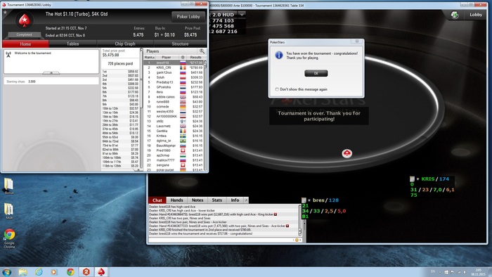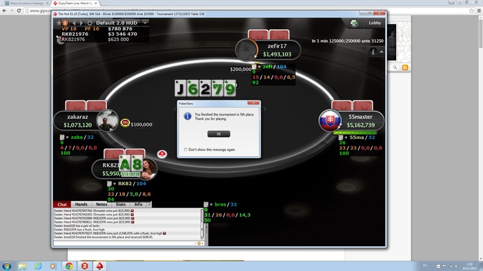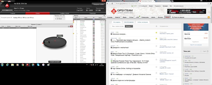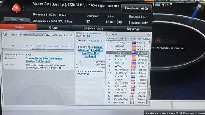 В Марте решил попробовать сыграть саттелиты на Pokerstars Championship Macau и Сочи, попросил у друга прислать 300$ на счет и начал играть спины по 8$, но затея оказалось минусовой, так как максимальное умножение выпадает всего х4, а так в 90% случаев только х2. Поиграв немного спины, решил играть свои любимые мтт, и в первый воскресный вечер загрузил 2 степа за 4.4$, в одном из них отобрался на сатт за 530$. Сразу отменил регистрацию, глупо было играть 1 турнир по цене стартового БР микролимитчика)) Но было хорошее настроение и мотивация, поэтому решил загрузить с турнирных денег еще один стэп за 44 $, выиграл его и меня сразу закинули в турнир за 530$, играл его спокойно и уверенно, когда оказался в трех столах подумал, что это хороший шанс и надо тащить, на финалку вышел 7-ым стэком и было 2 очень коротких стэка при 3 ех пакетах и 8-ми призовых, я решил, бабл лопнет и начну играть так как должен был, но к сожалению, коротыши удвоились и утроились, и теперь я стал ультра коротким и чуть не вылетел на бабле, который длился длился больше часа, я опускался до 2 бб и поднимался масимум до 5 бб, но в итоге только только 7 место. Если бы деньги не давили на меня, то с большой вероятностью смог выиграть пакет и сыграть на турнире, о котором давно мечтал, но как говорится не судьба)) В этот день я сыграл около 7-8 стэпов и в 5-ти турнирах был на финальных столах, забрал несколько конфет и выиграл сатт на 109 $ в Сочи, тоже отменил регу, так как он начинался уже по утро. Был крайне удивлен такому апчику, в итоге с нуля за 1 вечер удалось выиграть более 1700$, отправил ребятам 300$ обратно и у меня появился очередной БР на старзах))