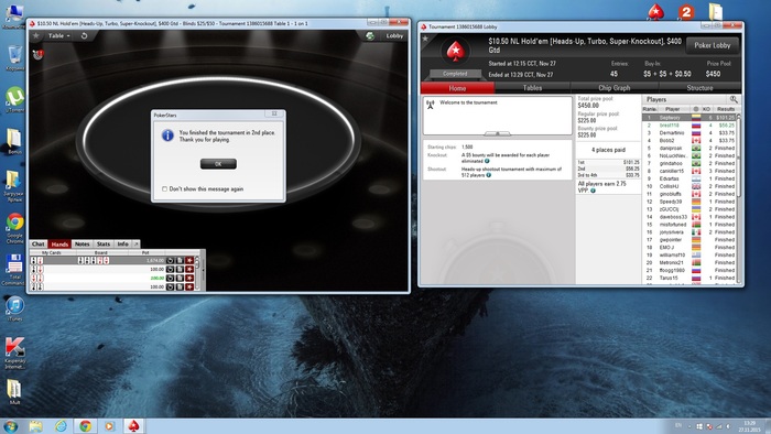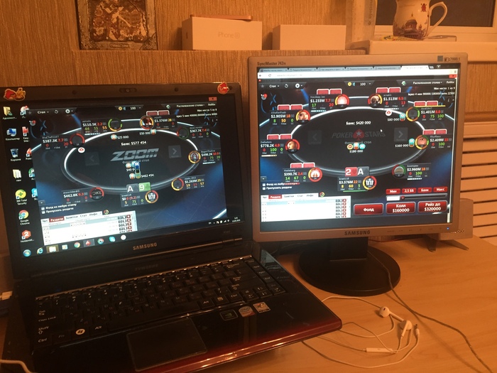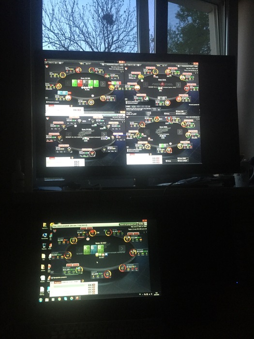Всем, привет! Приехали с семьей на Дальний Восток в отпуск, оборудовал себе местечко, чтобы немного покатать микро лимиты и не дорогие скупы Практически все турниры медленные, а начинаются в 22:00, 1:00 и 3:00 утра, поэтому играть практически не возможно. Купил пару долей у хороших ребят, надеюсь они стрельнут! Вчера вечером сел поиграть, сказал своим, что буду катать до утра и потом мне дали поспать, загрузил несколько побочных турниров, в итоге 2 финалки в килополях, в хоте 5.5$ в топ 4 при среднем 5-9 бб, остался: супернова, супернова элит и я, хотели поделить, начали диалог, я сбросил А8 с баттона, фиш немец проигнорировал нас, начали играть, почти выбили его, но ему повезло, в итоге у меня полный картдед и только 4 место((( Играть планирую мало, аби 5-7 и саттелиты. Летом хочу больше уделить внимание теории и оффлайну. Всем ГЛ!!!