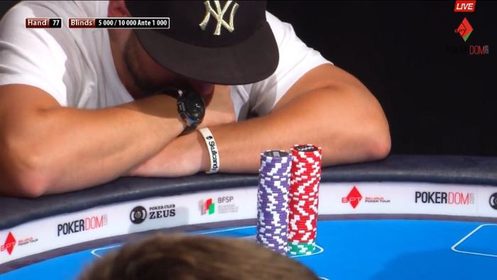 У Артура был короткий стэк в начале, но потом он начал уверенно расти и вышел в день 2 со стэком топ 10. Я пережил 1 пейджамп с 5 бб, удалось распушиться и удвоиться КК в 99 и сразу же когда осталось 54 человека я сыграл плохую раздачу с АТ мастевыми: у меня было 15 бб и я сделал ошибочный рейз с СО, вместо 2.2 бб кинул много мелких фишек и получилось ровно 3 бб, такой же стэк на баттоне запушил, я поторопился и не выкинул, там АК. Так я занял 52 место. Артур отлично отыграл и вышел на предфиналку, в топ 13 он выставился префлоп с QQ за топ 2 стэк турнира и бразилец после долгого раздумья не выкинул 66, вот что получилось…