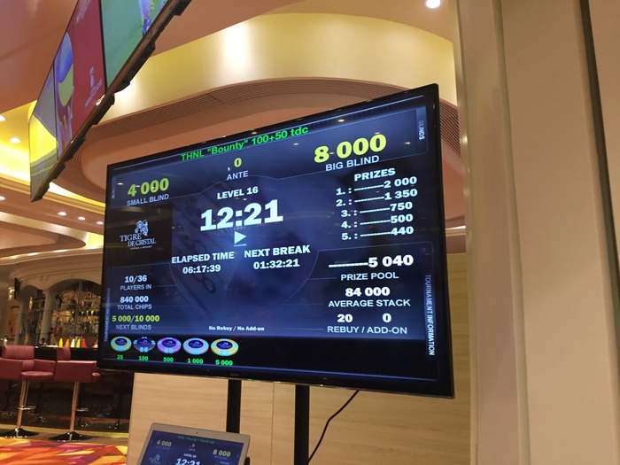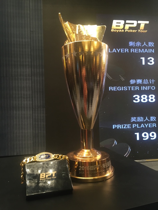 В Китае покер развивается семимильными шагами, покерные румы проводят множество серий по всей стране с большими гарантиями, больше всего у нас на острове, так недавно прошла трех дневная серия ВТР (Boyaa poker tour) на МЕ, как обычно, можно было попасть только выиграв онлайн саттелит, но в Китае на все серии дают билет и его можно передать любому человеку или продать, так и делают и на черном рынке цена билетов перед турниром поднимается в полтора два раза. В пятницу стартовал меин, при 388 входов было 199 призовых мест, за первое место давали золотой браслет с бриллиантами, огромный кубок и 90к долларов призовых. В субботу было несколько турниров, в которые можно было сыграть, супер нокаут за 300 у.е. и однодневный турнир с хорошей структурой за 1к у.е. Но мы уезжали и я смог сыграть только в воскресенье, было 2 турнира Хайроллеры за 2к у.е и турбо турнир за 90 у.е. с максимальным кол-вом человек-80 и призом 10 ноутбуков Mac Air. Я прикинул, что это выгодно и запрыгнул в него. По сути он оказался гипертурбо, стол был не дармовой, тем лучше. Я почти удвоил стэк, но потом к нам подсел новенький, оказался фиш, мы с ним разыграли большой банк , я атаковал с баттона он сделал колл на МВ, и платил все улицы и на ривере я поставил под аллин оставляя ему 12 бб в случае паса, на доске с закрывшимся флешом и верхним стритом, он долго думал, махнул рукой и решил заплатить по второй паре…так я остался короткий и не вытащил 30/70, в итоге 50-ое место, но уже тогда средний стэк был 12бб, на предфиналке при таком росте блаиндов средний стэк был, наверное, 3-4 блаинда, так что надо было вытащить еще не один важный алл инн)) Своей игрой я остался очень доволен, поэтому не пожалел, что запрыгул в такой гипер турбо турнир.