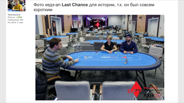 Затем я вновь отправился покорять ВРТ в сентябре, на который выиграл 2 онлайн саттелита на ME и GRAND. На серии у меня все складывалось как обычно)) в Гранде вылетел за 5 человек до денег с QQ >77>АК учитывая что А и К были в пасе. От турнира к турниру всегда одно и тоже- хорошее начало, затем авария и вылет в средней стадии турнира, обидней всего было вылетать в Супернокауте, где просто разрывал свой стол, был чип лидером, сделал 2 нокаута и за третий нокаут и топ стэк турнира проиграл на ривере в 1 аут((( меня пересадили за новый стол, по виду онлайн рег имея в стеке 16 бб открылся из УТГ, я запушил 12 бб с АК, он со словами, ну я тут должен коллировать сделал колл с JT разные…Ривер-J. Короче как всегда грязь и разочарование, но я собрался и сел в крайний однодневный турнир серии- Last chance с нормальной структурой, отогнал от себя все негативные мысли и начал играть в свою игру. Турнир складывался отлично, я показал свою А-игру, ни разу меня не переехали, только в ХА проиграл с KT в 9T и кубок ушел человеку, который играл в режиме God Mode)) Всего я был на трех сериях ВРТ в 2015 и 2016 годах и заметил такую интересную тенденцию, все турниры проходят в таком режиме: наращивание стэка-авария-грязь-вылет без ИТМ, и крайний турнир серии всегда выход за финальный стол и вывод серии в малюсенький плюс)) Пока 3 серии, 3 крайних турнира и 3 финалки , 6,7 и 2 место)) После я поехал в «Зевс» на розыгрыш призов, так как у меня было много билетиков, их оставляли люди, которые вылетали из турнира и уезжали домой. Героскутер и Айфон я конечно не выиграл, но зато сел поиграть в кэш омаху 1-2 у.е. Развалил регам всю игру и они начали расходиться, остались втроем, всем стало скучно и мы закончили, в итоге +200 бб. Сейчас играю в разные игры, для общего развития, омаху, ананас, даже в джим рамми)).