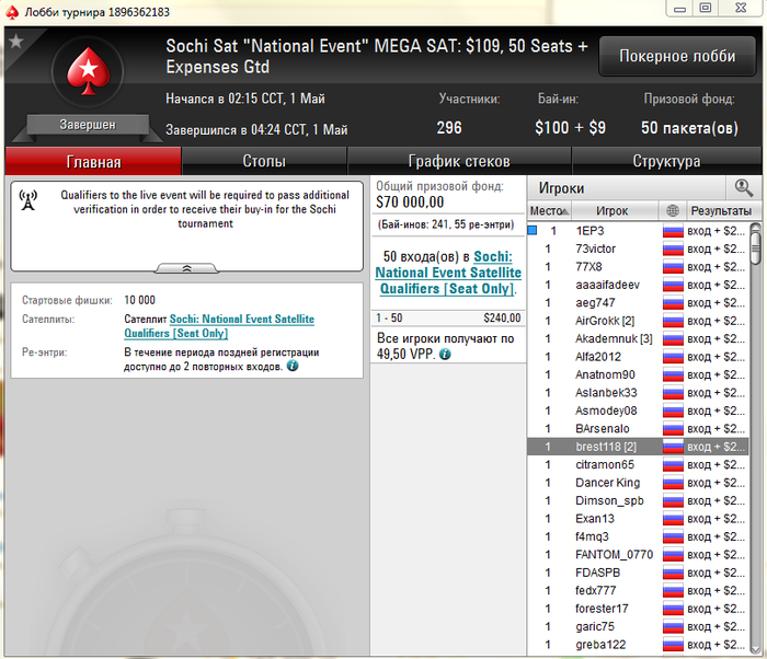 Старзы объявили 2 мегасатта на МЕ и National Championship Сочи. Ожидались оверлеи, поэтому надо было играть! Сыграл 7 стэпов на сат 530$ МЕ, побывал на 3-ех финалках, но везде проиграл с верху, не потащил важные монетки, на прямую заходить не стал. Выиграл сатт за 5$ на 109$ National Championship, но и там проиграл AJ в Т9, оставалось 150 человек при 50-ти проходов, поэтому пришлось зайти за баин. У Старзов оверлей на 2 события составил-80к $, спасибо что не жадничаете))