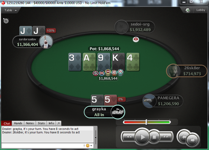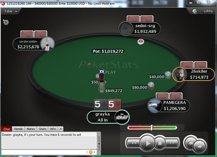 Иду 12 из 27, турнир очень утомительный, на данный момент длится 7,5ч., так что победить хочется вдвойне. Параллельно залетел в кеш зум, результаты удовлетворительные, после турнира подведу итог в финансовом плане и т.д.