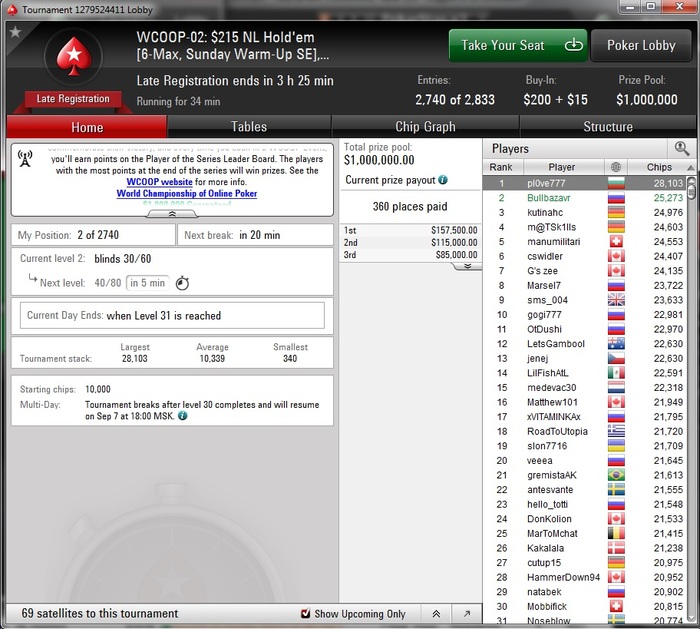 Ночной турбо турнир за 44$ с гарантией 35к $. Блайнды 30-60, в моем погрызанном стеке 40ББ, у оппонента - активного ЛАГа (32/17/5) глубокий стек (106ББ) и он на СБ. Я с хайджека делаю минимальный рейз с