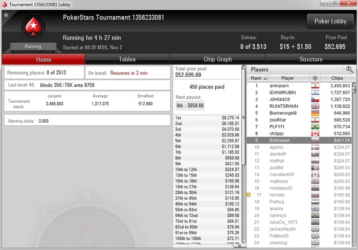 Poker Stars $40+$4 No Limit Hold'em Tournament - t30/t60 Blinds - 8 players