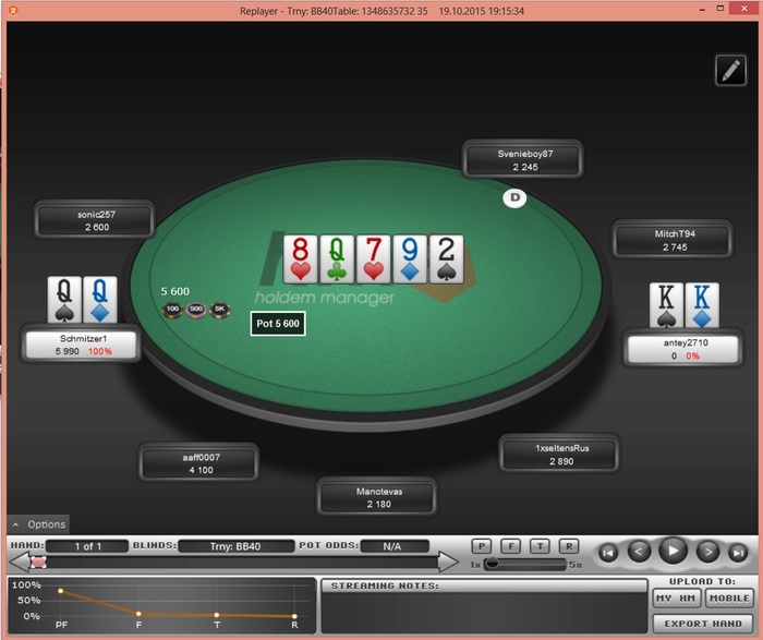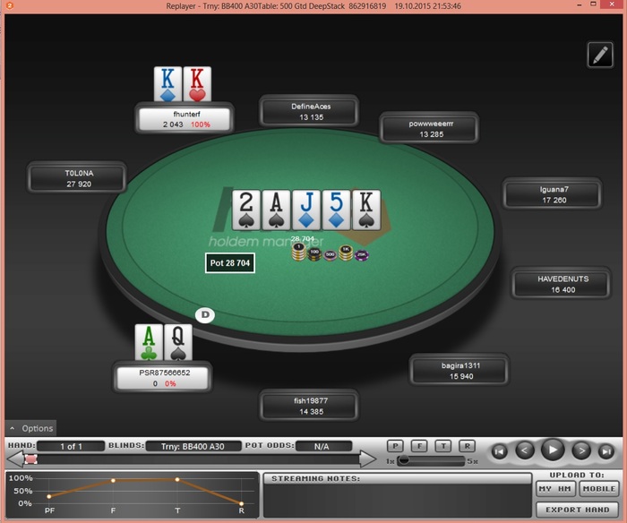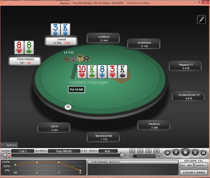 Рой – собственно не порадовал. Есть проблемы в постфолопе, а так же есть проблемы с монеткой которая упорна не ложится в мою сторону. Выходя за финальные столы, к сожалению был съеден, более слабыми руками. Ситуации все проверял, иного решения как то, которое было, приято не выбрал. Все еще принимаю импульсивные решения, и это считаю своей самой огромной ошибкой. Так если при розыгрыше вдвоем, как правило, ошибки незначительные, то есть недоработки при игре в три и более игрока.