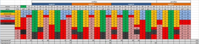 График мой, на ближайщий месяц. Выходных все меньше. С 3 скорее всего закрою спортзал. Только вопрос поможет ли это. Зеленым отмечена работа суточная, после нее конечно хотелось бы поспать, но увы видимо не получится.