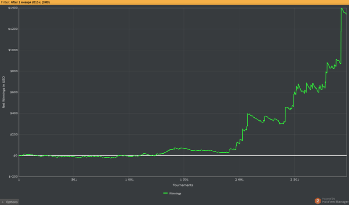 Изменил расписание. По результатам года: + Заметно повысил уровень игры. Это подтвердил и рой и 3 анализа рук на бирже. + Показал хорошие результаты по профиту. + Приобрел лицензионный ХМ + Нашел двух постоянных беккеров.