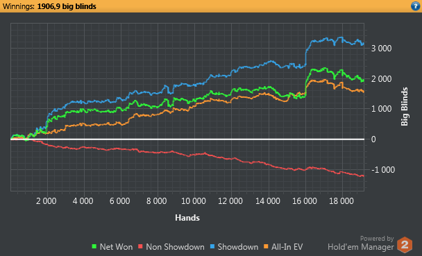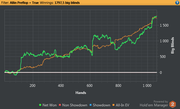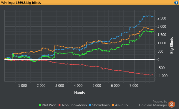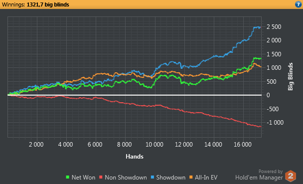 Отыграл сессию на 888+ipoker , 73 турнира,сегодня играл лучше всего за этот период,финалок штук 7-8,в которых 500+за первое обязательно снимали 8-9м 80 на 20%,отбивался дешевыми дипами и нетурбо ребайниками(2 или 3 топ 1)короче жду пока отдаст в так сказать дорогих ,в последнем турнире 5+р на 888 была такая ситуация,у меня 100к стек,у чувака 1млн,и ситаут с половиной моих фишек,но пидор чипак отдавал бб ситауту я тильтанул и сделал не лучший колл,но думаю он бы и так меня дожал. Винрейт :