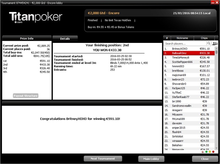 Вот такой вот получился март на титане, турниров мало, т.к. перестал играть старзы и 888. Пока не окрепнет бр буду играть только айпокер. Месяцем в принципе доволен, только косяк в дисциплине, как всегда впрочем, будем исправлять в апреле.