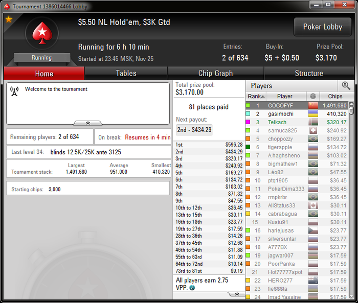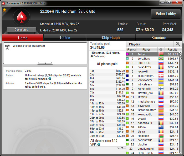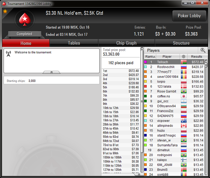Решил начать подгружать в сессию МТСНГ 2,5$ Turbo на 180 человек. Вчера вроде неплохо вышло, из 20 сыгранных Топ1, Топ3, Топ5, и два Топ17. Ну и в фризе за 5$ - Топ3: