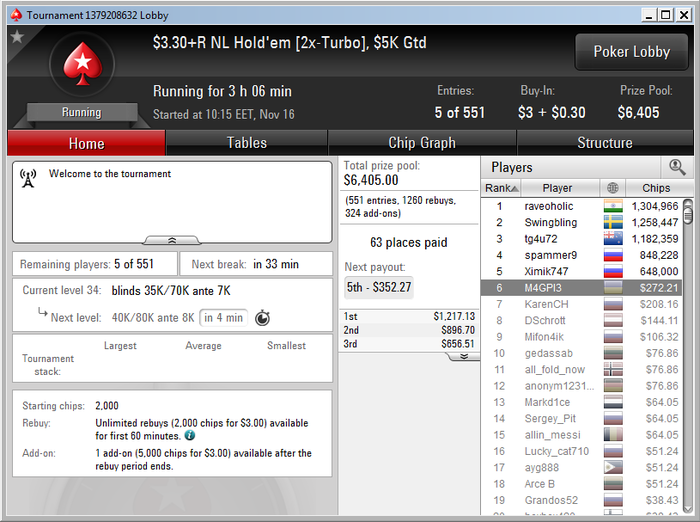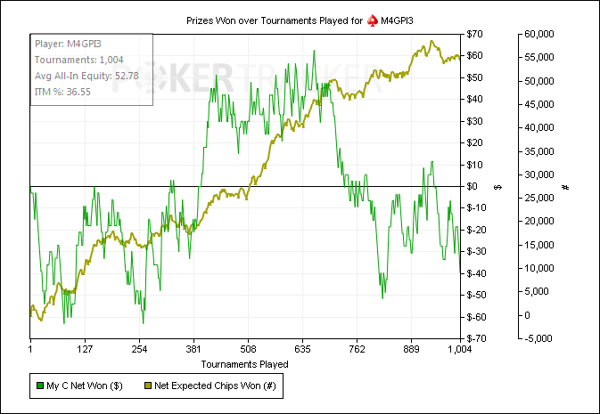 Какой-то не понятный ап, действительно тупо убивали во многих турнирах за хорошие стеки и в дурных ситуациях где хоть немного адекватный оппонент легко должен выбрасывать префлоп. Но в тех 2 турнирах ГСЧ был явно на моей стороне.