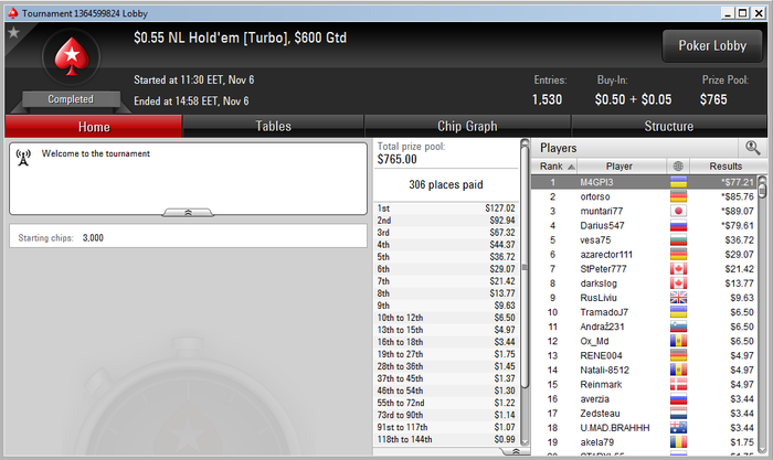 30 $ что оставались залил за 2 дня, еще день был в депрессии. После чего подключил новый (как оказалось хороший и стабильный интернет) депнув половину всех денег которые были, а именно 70$. И начал максимально серьезно играть МТТ, составил график и даже более или менее придерживался банкролла. И вот наконец на 4 день апнуло, где я норм так на айтиемил так еще и стал 6 в самом дорогом и большом турнире в моей утренней загрузке. Дальше продолжу в том же духе - только МТТ, только хорошая, обдуманная игра с максимальной концентрацией на столах и по банкроллу (который наконец-то есть)