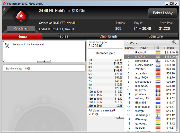 M4GPI3 @ 23.10.2015 и если к 23.11.15 там не будет хотя бы 450$ то на этом с покером все и навсегда закончится.