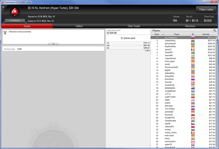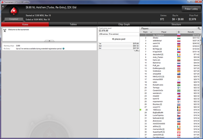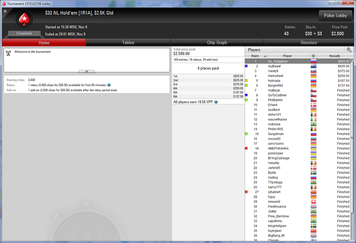А по 33$ наоборот складывалось. Наконец-то мне отдался этот турнир. В топ три была равная игра, фишки перетекали от игрока к игроку, а в Ха играл с топ регом и неплохо себя чувствовал, потому что есть опыт игры один на один в стеках 25бб. Ну собственно и результат.
