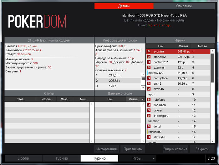 Зря сегодня сел катать не выспавшимся. Из за дел в оффе поспал всего 3 часа. Играл, мягко говоря не оптимально:) В итоге день закончил в ноль. 5 итм было, но все с 3 по 9. Перепутал гиперкнок за 21р с другим и зарегался, пришлось тащить:)