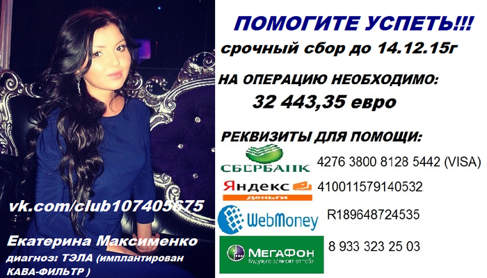 Только сейчас прочитал тему - речь об однокурснице друзей. Никакой дополнительной информацией кроме указанной в теме не обладаю, но готов принять переводы на старзы и затем все передать по указанным реквизитам (в офиц теме вконтакте). С ТС не знаком, но вряд ли он будет против.