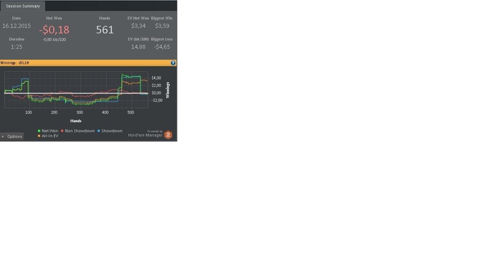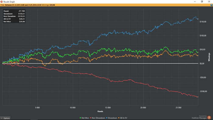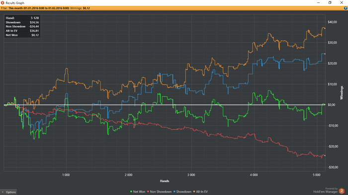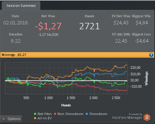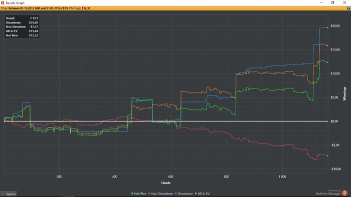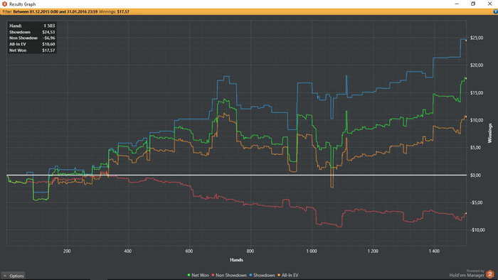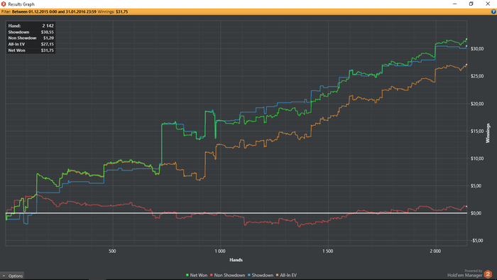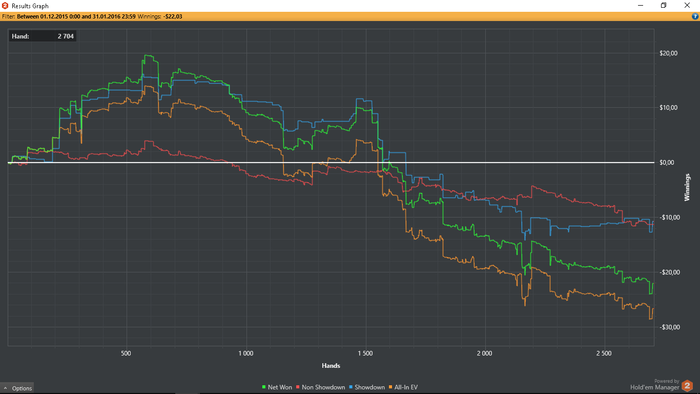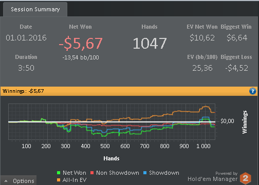 Последние дни 2015 были чересчур насыщены и я просто не успевал выкладывать графики. 888 на меня реально засинили: они или не закрывали ничего, либо ушатывали не взирая на ранги. И, если в конце 5 сессии мне дистанция немного вернула, то последняя сессия все исправила )) Первая тысяча рук последней сессии: Итог 2 месяцев несколько плачевен: Даже не взирая на то, что цель минимум выполнена и банкролл на нл10 я набил (25 бай-инов), ожидания были несколько выше. В связи с затяжными даунстриками и недодачами приходится делать корректировку и новой целью будет 40 бай-инов для перехода на лимит. На конец года банкролл на 888покер составил: $367.18. Ближайший план - 8 бай-инов на нл4, для перехода на нл10. В феврале планирую перейти с нл10 888покер на нл10 (а если сложится и на нл25 старзов), закончив тем самым свою личную забастовку. В принципе на 888 меня все устраивает, кроме двух моментов: отсутствие постоянной игры на нл20-нл50 фр и долгие кеш-ауты (хотя на данный момент последнее вторично).