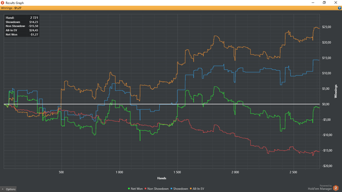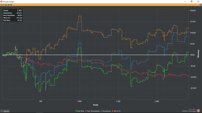 Посмотрел некоторые минусовые раздачи, чтобы не повторять ошибок и слил еще 3БИ... хотя один под вопросом.. В целом последние 1500 рук сыграл неплохо: В итоге сессия вышла не самой конченной: Вторая неделя месяца подходит к концу... вин-рейт в районе 6бб/100, что при передаче очень низко. Будет еще одна сессия, чтобы привести первую половину месяца к лучшему виду. Что не получается: 1. По-прежнему играю очень широко для фуллринга. Буду стараться опустить впип с 17 до 15 до конца месяца. 2. Низкая постфлоп агрессия - 2,0, хотя за прошлый месяц была 3,4. 3. Проход до шоудауна поднялся с 27 до 30, что вызывает постоянные скачки на графике: думаю, что связано с тем, что много подкалываю фишей на коннекторах/полуконнекторах и одномастных тузах - короче, опускаю впип. 4. Ссука, бороться с тильтом. Сегодня разбор сессии и промежуточные итоги первой половины декабря.