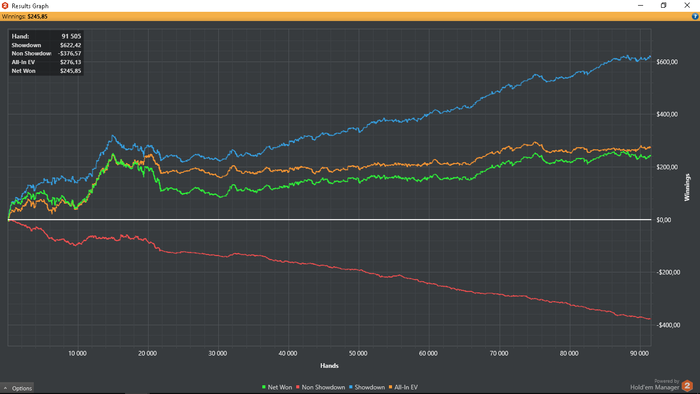 Позавчера закончил сессию как-то так: Не скажу, что доволен результатом, но игрой доволен... А вот вчера даже разок доехал в двоих, хотя эквилаб показал +ЕВ, т.к. по шансам банка мне нужно было 29% на колл, а было 35%. А вот каре троек против натс-фула мне картинку подпортило... Но, итогами доволен, чего лукавить: почти 38бб/100, +8БИ Удалось снизить впип до 15,6, а постфлоп агрессию поднять до 2,9... есть куда идти... Не знаю на сколько хватит темпа: разбор, тренировка по подсчетам, разбор базы товарища, чтение, воды... уже начинаю лениться...