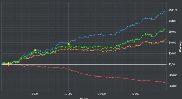 Размышлизм, кто из двух хиро как сыграет на дистанции в две недели на микролимитах. 1. Новичок, ну очень ограниченный в познаниях, разве что ни психует и не занимается откровенной фигней, а очень даже хочет разобраться что тут к чему, но нет нет да и заколирует не по шансам, или не там поставит.