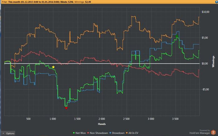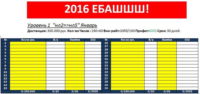 Всех с наступающим новым годом! 2016 год я целиком и полностью отдам покеру, и если не увижу положительных результатов то пожалуй буду искать себя в чем то другом, благо в эпоху интернета сменить занятие очень просто, главное делать все с меньшим кол-вом ошибок и в любой сфере можно раскрутиться. Но я люблю эту игру и по стараюсь сделать так что бы она стала моим единственным и качественным источником дохода. Заготовил план начинаю 2-го Января. Так как первого скорее всего буду еще пьян.