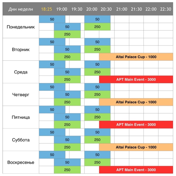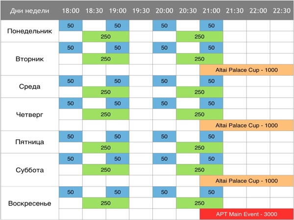 «Шаг 1». NL Hold'em. Бай-ин - 50 руб. Стек - 1,500. Уровни - 5 мин. Ребай неограничен, эдон после 6 уровня. Призы - билет на «Шаг 2», сдача - баббл-бою* «Шаг 2». NL Hold'em. Бай-ин - 250 руб. Стек - 2,000. Уровни - 5 мин. Ребай неограничен, эдон после 6 уровня. Призы - билет на «Шаг 3»**, сдача - баббл-бою «Шаг 3». NL Hold'em. Бай-ин - 1000 руб. Стек - 2,000. Уровни - 10 мин. Два ребая, эдон после 6 уровня. Призы - билет на Altai Palace Cup (10К), сдача - баббл-бою «Шаг 4». NL Hold'em. Бай-ин - 3000 руб. Стек - 3,000. Уровни - 10 мин. Два ребая, эдон после 6 уровня. Призы - билет на APT Main Event (30К), сдача - баббл-бою