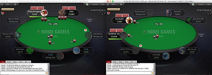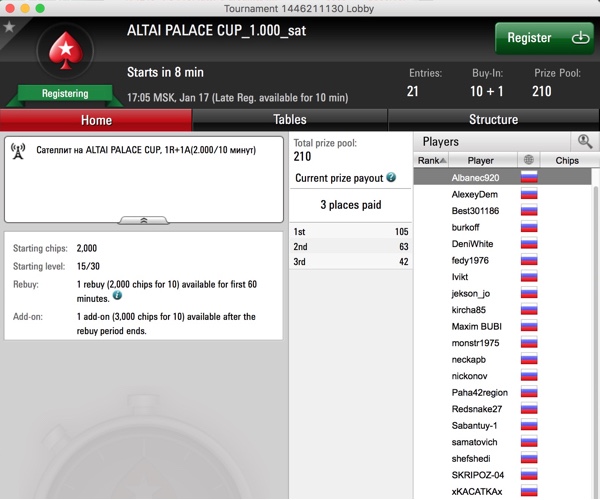 Уже за час до старта сата на Altai Palace Cup записался 21 игрок. Ждали, что вот-вот их станет еще больше, но... перед стартом модератор клуба начал безжалостно отсеивать тех, кто по каким-то причинам не внес бай-ин. Первая ошибка, которая, будем надеяться, больше не повторится. Во избежании ее читайте нашу шпаргалку. Оказалось шестеро лишних. Удалять их было поздно, - и они постепенно раздавали свои стеки (из-за этого отчасти малость сломалась рассадка по столам).
