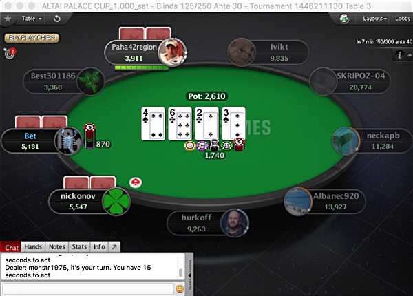 Цифры по первому сателлиту APT нарисовались такие: 15 участников, 6 ребаев, 10 эдонов, призовой фонд - 31,000 (рэйк в онайн-сателлитах, посовещавшись, решили не брать). Таким образом на кону были три билета на Altai Palace Cup плюс 1,000 "event money" для 4-го призера (их можно брать для бай-инов).