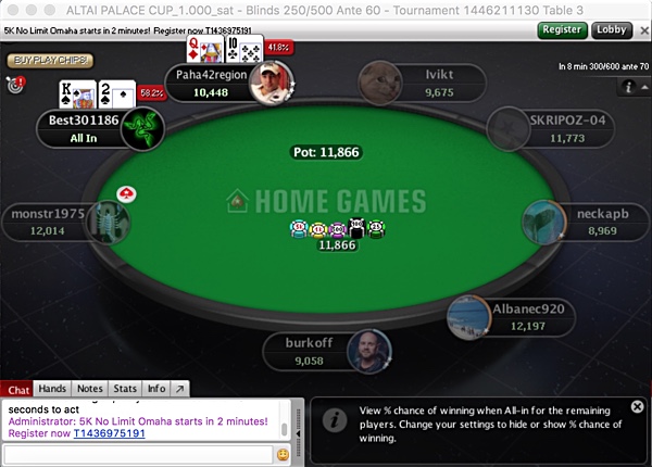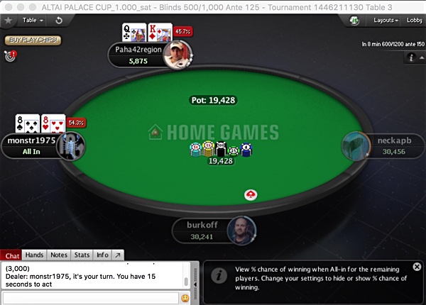 Внимание, не принимайте «условные фишки» своего аккаунта Home Games на PokerStars за реальные деньги. Отображающиеся там цифры не имеют никакого отношения к состоянию вашего счета - отчеты по суммам у игроков клуба будут публиковаться ежедневно по заверении сессии сателлитов.
