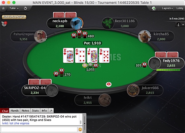 А у оставшейся четверки стеки оказались практически равными. Шершнев все еще был немного впереди, но разница составляла несколько блайндов.