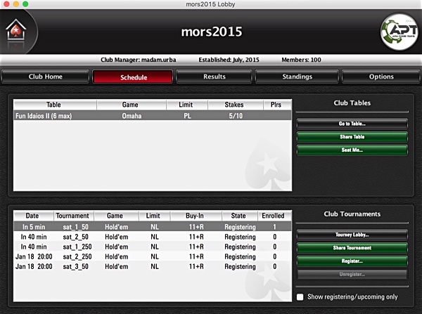 Во всем остальном система управление Home Games не отличается от лобби основной страницы PokerStars. В случае возникновения вопросов, жмите кнопку «Помощь», где вас ждут исчерпывающие инструкции по всем темам. * Вплоть до воскресенья количество членов в «mors2015» ограничивалось ста, но теперь мы получили право расширить число членов до 500, так что место там найдется всем желающим. Если нам будет тесно, расширимся еще.
