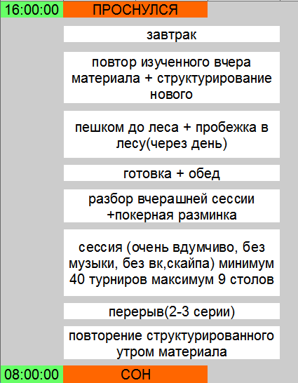 Набросал вот такую бодягу (буду как-то укреплять свою ментальность, раз уж с ней проблемы): Сегодня был первый день, как я начал бегать, спать хочу уже сейчас,а ведь середина дня. Но ,говорят, когда привыкнешь - сил, наоборот, прибавится. Еще набросал файлик (там же в либреофисе) по "покерной разминке". В ней перечислены основные составляющие всех диапазонов, количество комбинаций, проценты от общего числа рук, и прочая лабудень(разные задачки), мне нужно будет по памяти восстановить их, проверить. Ну еще несколько заданий.