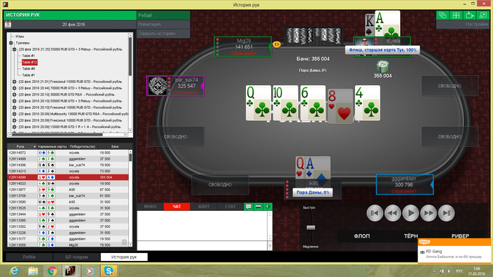 за сегодня 1 итм.по сути когда опп ,который идет вторым ,выставился со своими 3бб,я и вторая макака его приняли,у меня 66 флоп 1093 чек чек,терн 2 я чек он ставит пол банка,ривер 9 опп пушит я фолжу, макака блефер показал JK а коротыш А3,потерял 4.5к... Ну и в заключительной раздаче отлетел А9 против 33 гг вп