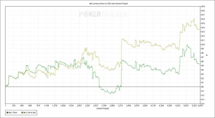 Первые 6 тысяч рук были кошмарные; горел то 9-10$, то почти в 0 обивался,и так раза 2)) болтало туда-сюда. Хотел в 0 выйти и закончить,но не судьба. Закончил -4$ и решил отдохнуть.