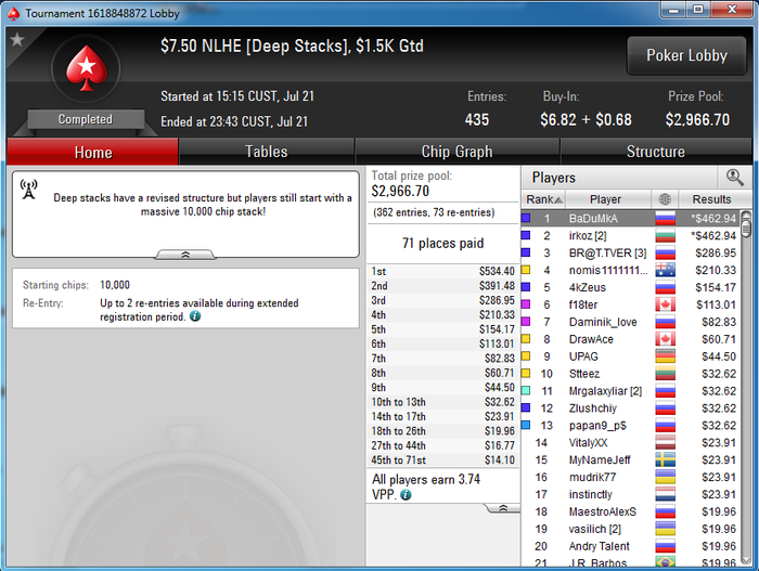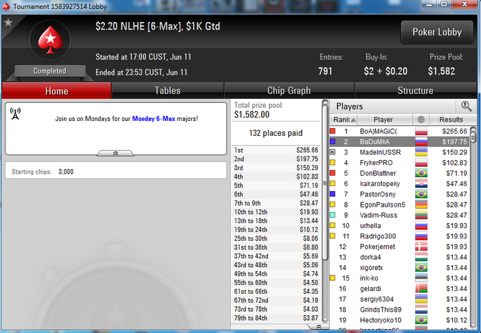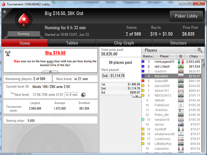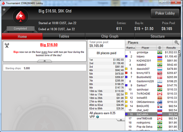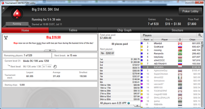 Сыграл вчера биг за 16,5. По собственной ошибке вылетел 16м. Сегодня отыгрался, но из-за куллера вылетел 4м, хотя шел со 2м стеком. Результатом не очень доволен. Хотя начиная с топ-20 и до финалки шел коротышом с 15бб, поэтому в целом норм.