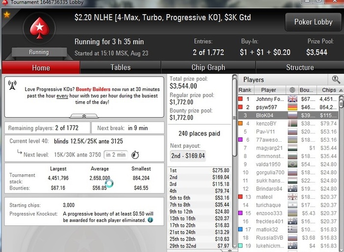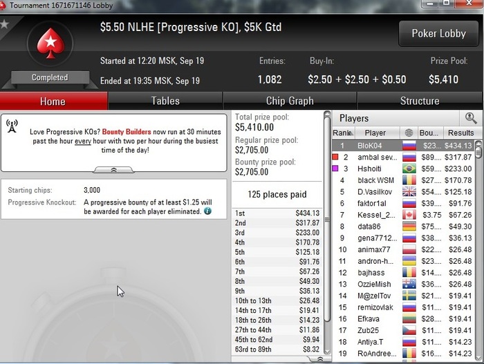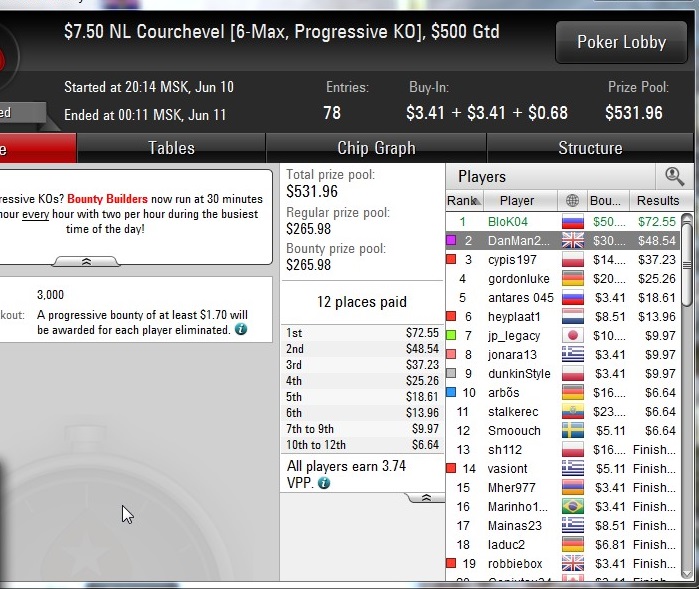 Сегодня был день упущенных возможностей. Вроде и плюсанул почти 400$, но сложился бы по иному хотя бы один из трёх турниров, где я вылетел 8-9ым, то было бы всё куда приятнее. Днём выиграл турнир, что настроило на оптимистичный лад: Попозжее запустил ещё одну сессию, в ходе которой занял 8ое место в турбированном ребайнике за 2,2 и 9-ое место в ребайном снг за 3,5 (впервые решил его запустить, вполне успешно, однако), где выиграй я АK в AQ за огромный чиплидерский стек, то... Под конец запустил ещё два турнира - прогрессив-нокаут за 22 и 8 игр за 11. В обоих быстро набил неплохие стеки, но в 8 играх сыграл ужасную раздачу в ПЛО и вскоре вылетел, а в нокауте мне просто начали дарить стеки, в итоге к баблу я шёл стабильно в тройке лидеров. Да и до топ-20 я чувствовал себя более чем прекрасно, однако к стадии двух столов мой стек перестал расти, а у противников напротив начал ускоренными темпами. В итоге всего лишь 9ое место, при весьма значительных призовых.