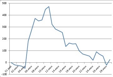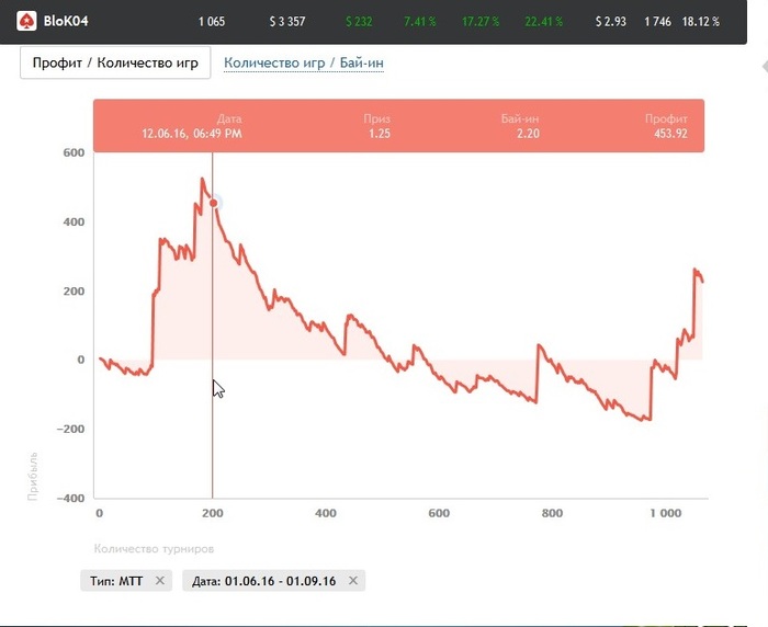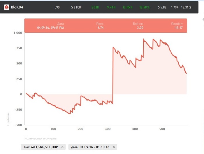 Последние дни были откровенно неудачны, причём, как складывалось не очень, так и я периодически играл ужасающе. Коллы в никуда, дебильные блефы и многое иное было натворено мной. Итогом чего стал весьма существенный минус. Однако всё могло быть спасено, но в поздней стадии в прогрессивном нокауте за 5,5 меня посадили к двух абсолютно отмороженным товарищам с большими стеками, которым ещё и раздавали крайне удачно. Начал я там с 4 стеком из 23 оставшихся, потом карманные десятки против уникума, протянувшего 82o по совпадению, затем против гиперагрессивного чипака в на cтоле . Остался в итоге с огрызком от стека, кое-как распихался, удвоился с королями против дам, ну а потом две пары в стрит-дро, которое разумеется на ривере и закрылось. Я бы не писал такое полотно, ибо к этому можно уже привыкнуть, но я в диком расстройстве, ибо 10 место меня вообще не устроило. А вообще стоит подвести, пожалуй, промежуточные итоги с возобновления дневника, которое удачно совпало с началом месяца. Поскольку я лентяй и раздолбай, то здесь красивого графика из Sharkscope не будет, а будет унылая строчка, конспектирующая результат. За июнь пока: 244 турнира + 135 СТТ - +282,67