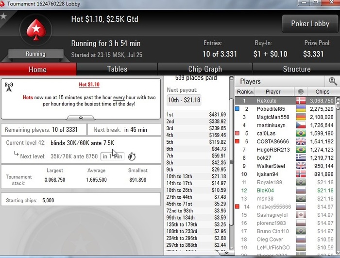 Запустил под футбол несколько турниров, чтобы совсем не отчаиваться. В 3максе катали туда сюда почти полчаса до того момента, как средний стек не стал равен 15 бб. А в условиях такой ситуации, да и с коллегами по СНГ - грех не поделить.
