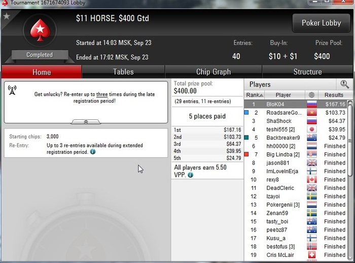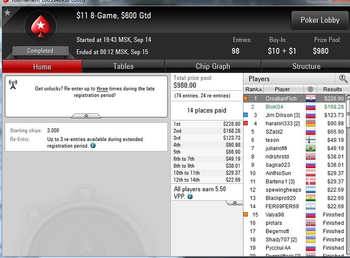 Третий день в плюс даже не может вывести этот месяц в плюс. Хотя вот график по 8 играм должен вывести после этого турнира где-то даже в ноль. Ещё вчера смог впервые выиграть турнир за последние два месяца, что меня крайне порадовало. Пусть это и бомжатская HORSE за 2,2, но всё ж приятно.