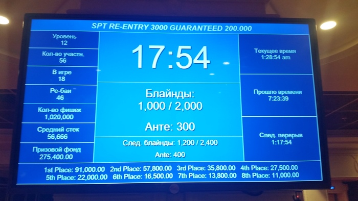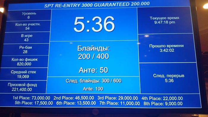 2 день "SHAMBALA POKER TOUR" 12:00 САТЕЛЛИТ 18 участников 5 билетов 15:00 САТЕЛЛИТ 29 участников 6 билетов На данный момент на основной турнир PROGRESSIVE BOUNTY по предварительной регистрации записалось 57 участников!