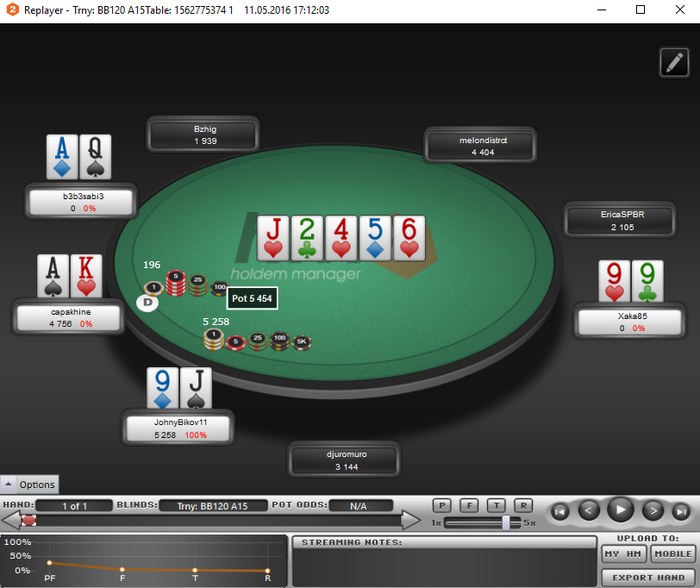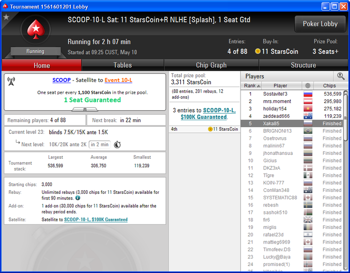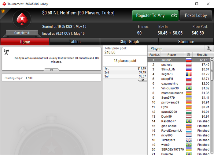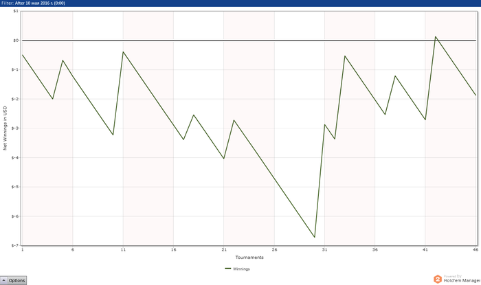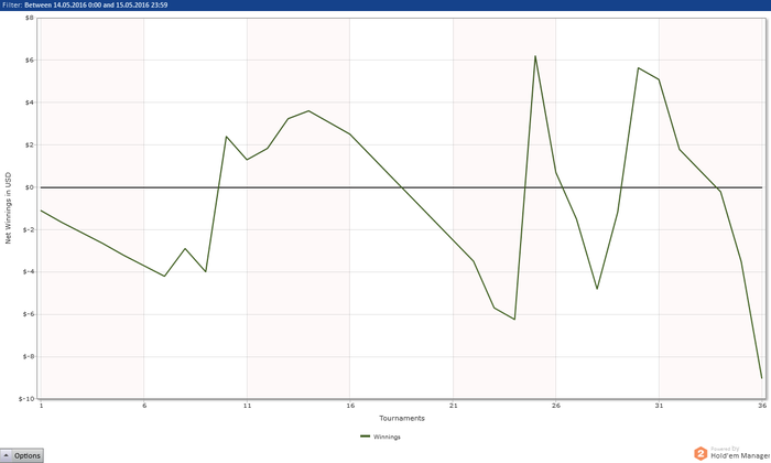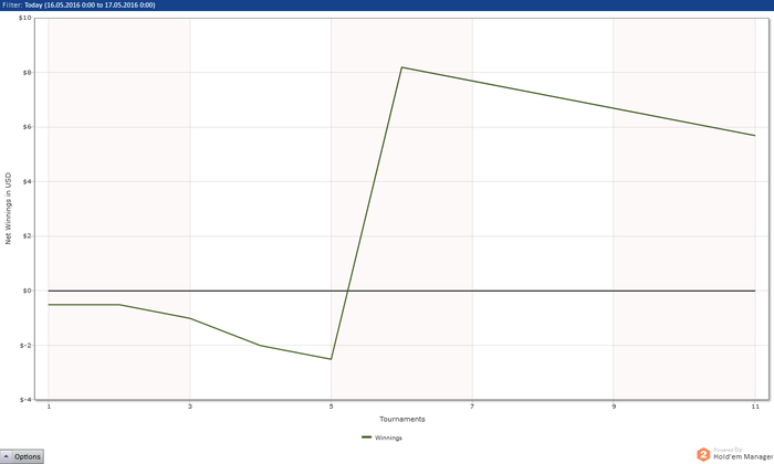 Опять я отморозился и полез катать МТТ - всё бы ни чего, и они мне очень даже нравятся да вот только БР не позволяет + за каким то фигом, зарегистрировался в двух турнирах по 5$ (на самом деле там были самые маленькие поля, в ближайшее время, только с этой мысль) которые благополучно слил. Самое большое достижение вышло: турнир 2.20+R из 100 участников занял 11е место, заработав 14.64, сделав один ребай (удвоился) + аддон. В итоге, всё залив, в том числе и горькими слезами, депнул 15$ и решил начать всё по новой, в родных и любимых СНГ за 0.5.