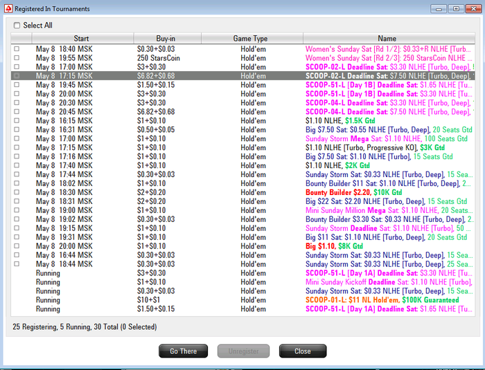 Может отменю регистрацию в некоторые более поздние турниры, если больше 10 столов одновременно будет)