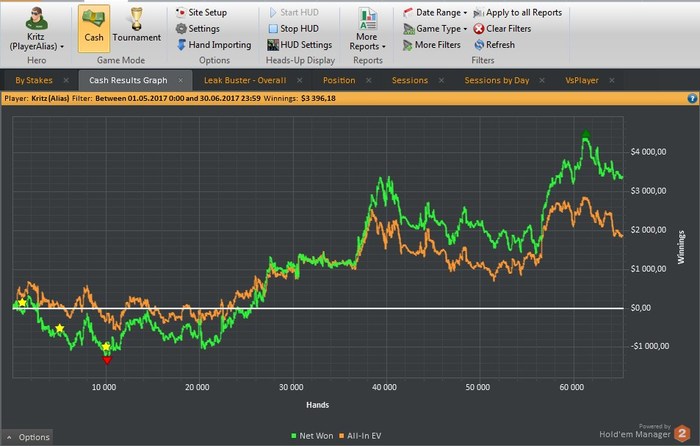 Хай всем. С опозданием, но все-таки отчитаюсь за апрель. Был непростой месяц, поэтому не так много рук. По-прежнему продолжаем трениться до нл50 включительно. Сейчас в основном стараюсь катать нл 200-400, а пока набираются столы, то и нл 100.