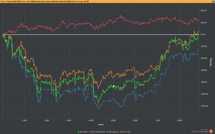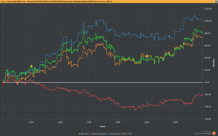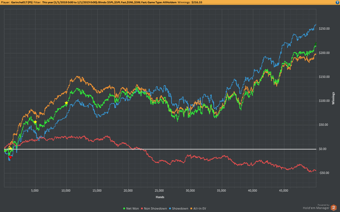 Декабрь провёл в зуме NL5 Всё нажитое было уничтожено за две зубодробительные сессии. На 31 декабря (последняя вертикальная линия в конце графика) раздал подарков на отлично ))). Очень поучительные - психику ещё пробивает, но уже начинаю справляться с таким даже без пауз. Что не убивает банкролл - делает сильнее.