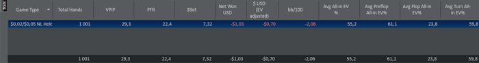 Start Bankroll 365,13; Stop Bankroll 363,95$. Столов: 2; Мини сессий : 5; Рук: 1000; Время =320 мин ; Результат = -1,03; bb/100 =-2,06 . Цель на день выполнена на -11,4%; Цель на первый игровой отрезок выполнена на -0,74%